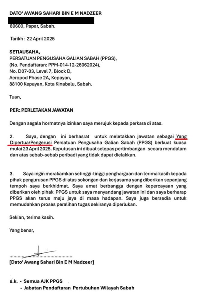 Serentak dengan itu, tiga pemimpin utama Persatuan Pengusaha Galian Sabah (PPGS) turut meletakkan jawatan secara rasmi pada 23 April 2025:
