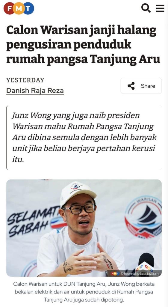 KOTA KINABALU: Calon Warisan di Tanjung Aru, Junz Wong, sekali lagi muncul dengan skrip ulangan — mendakwa beliau ingin “menghentikan pemindahan penduduk” dan “membina semula Rumah Pangsa Tanjung Aru” sekiranya menang PRN. Namun kenyataan itu bukan sahaja mengelirukan, malah bercanggah sepenuhnya dengan rekod dan dokumen rasmi Kerajaan Warisan sendiri.