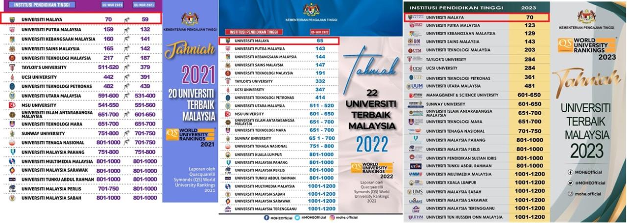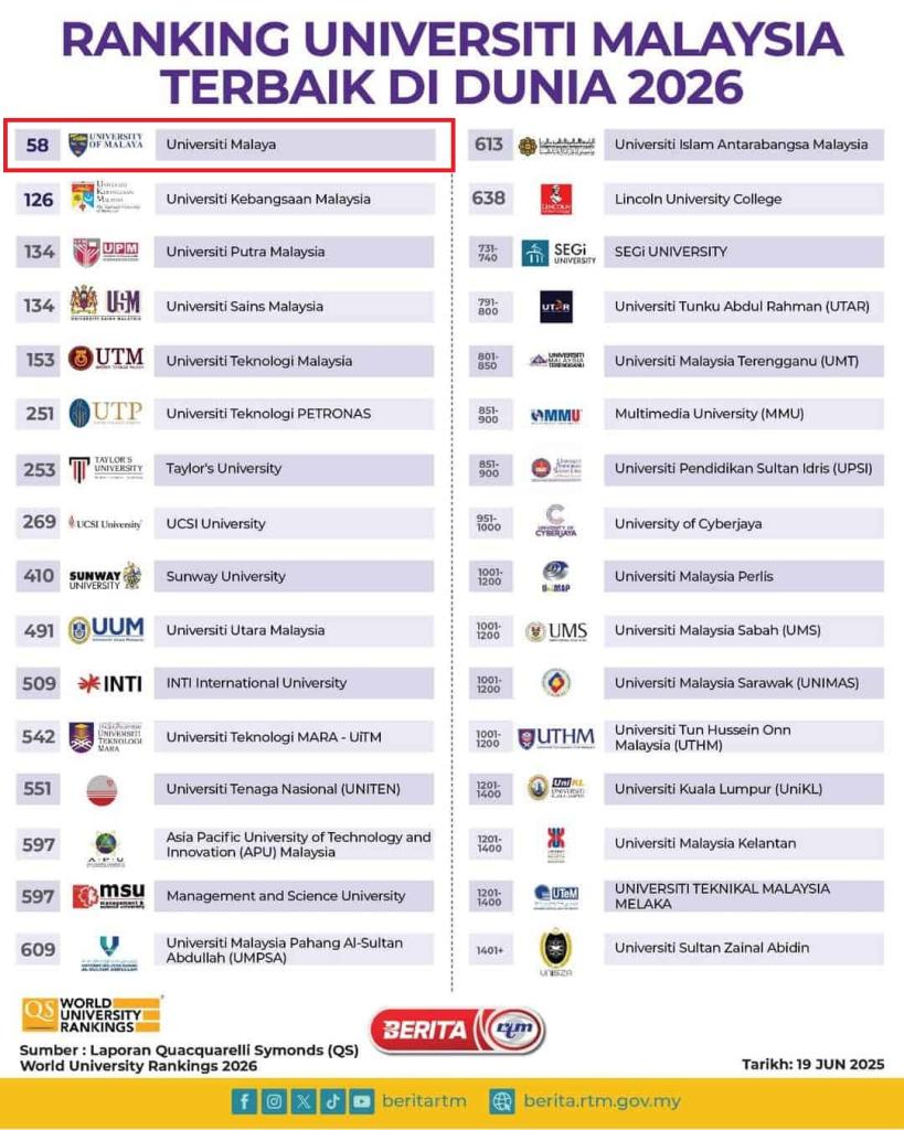 Universiti Malaya (UM) menduduki tempat ke-60 di dunia tahun 2025 dan 2026 kedudukan 58, menjadikannya universiti Malaysia tertinggi dan satu-satunya Malaysia dalam Top 100 global yang meningkat setiap tahun. Dalam tempoh 6 tahun lalu UM dari 70 kepada ranking kini 58!