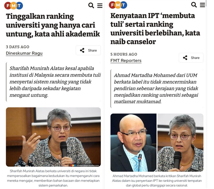 KOTA KINABALU – Kenyataan sarjana bebas Sharifah Munirah Alatas bahawa penyertaan institusi pendidikan tinggi (IPT) Malaysia dalam sistem ranking universiti global dilakukan secara membuta tuli dan tunduk kepada logik ekonomi neoliberal, kini terbukti bukan retorik kosong — sebaliknya selari dengan realiti yang telah lama didedahkan.