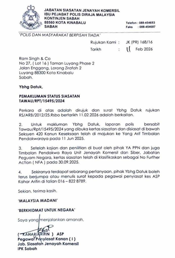 Surat rasmi Jabatan Siasatan Jenayah Komersil (JSJK) IPK Sabah bertarikh 11 Februari 2026 mengesahkan bahawa kes bernombor Tawau/Rpt/15495/2024 telah disiasat di bawah Seksyen 420 Kanun Keseksaan sebelum dirujuk kepada Timbalan Pendakwa Raya pada 11 Jun 2025. Namun selepas penelitian menyeluruh oleh Unit Jenayah Komersil dan Siber, Jabatan Peguam Negara, kes itu diputuskan sebagai tiada tindakan lanjut pada 30 September 2025 — lazimnya menandakan bukti tidak mencukupi atau kesalahan tidak dapat dibuktikan di mahkamah. Surat berkenaan dilaporkan diterima melalui Tetuan Ram Singh & Co.