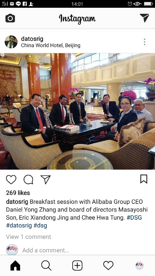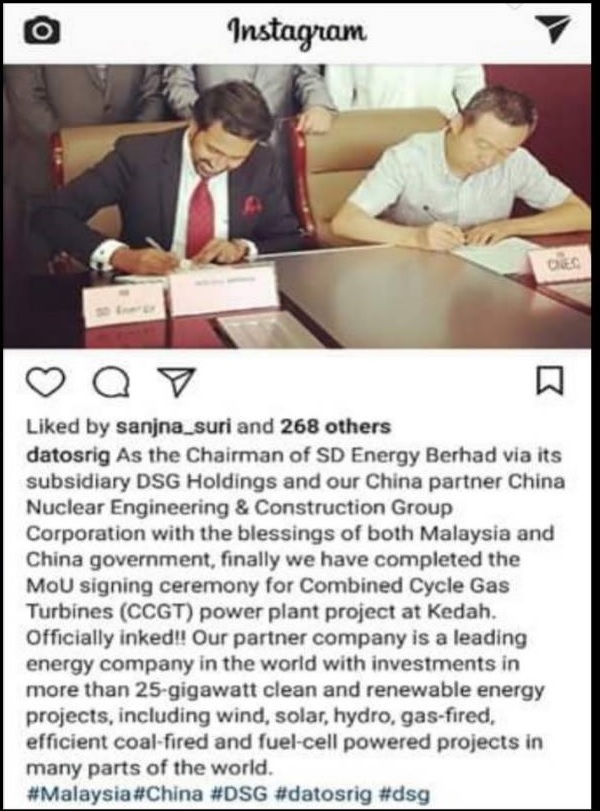 Di China Dato’ Gnanaraja penipu ini menunjukkan dalam instagramnya beliau selaku Pengerusi SD Energy Berhad bersama China Nuclear Engineering & Contruction Group (CNECC) menandatangi MOU stesyen janakuasa baru Combined Cycle Gas Turbine (CCGT) di negeri Kedah. Beliau turut memaparkan gambar-gambar mesyuarat bersama CEO Ali Baba Group dan CFO Zhejiang Geely Holdings Group.