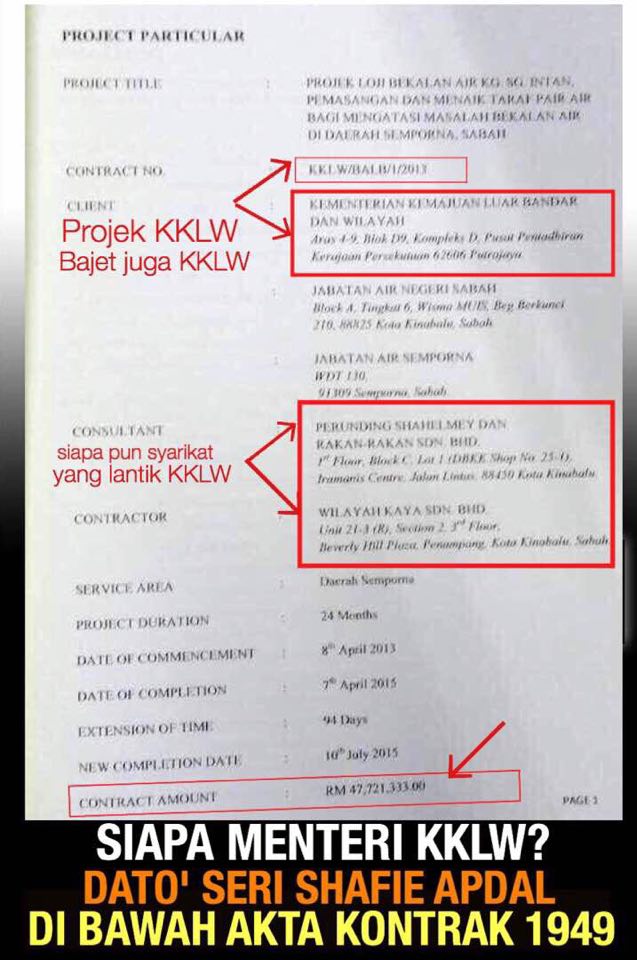 Dokumen yang dipaparkan oleh blog itu menunjukkan kontrak itu bukan RM45 juta tetapi RM47,721,333.00 dan maklumat menunjukkan ia projek milik KKLW bukan Kerajaan Negeri Sabah. Jabatan Air Negeri Sabah (JANS) dan Jabatan Air Semporna hanyalah agensi pelaksana. Peruntukan dan kuasa melantik kontraktor adalah KKLW atau lebih tepat Menteri KKLW ketika itu Dato' Seri Shafie Apdal.