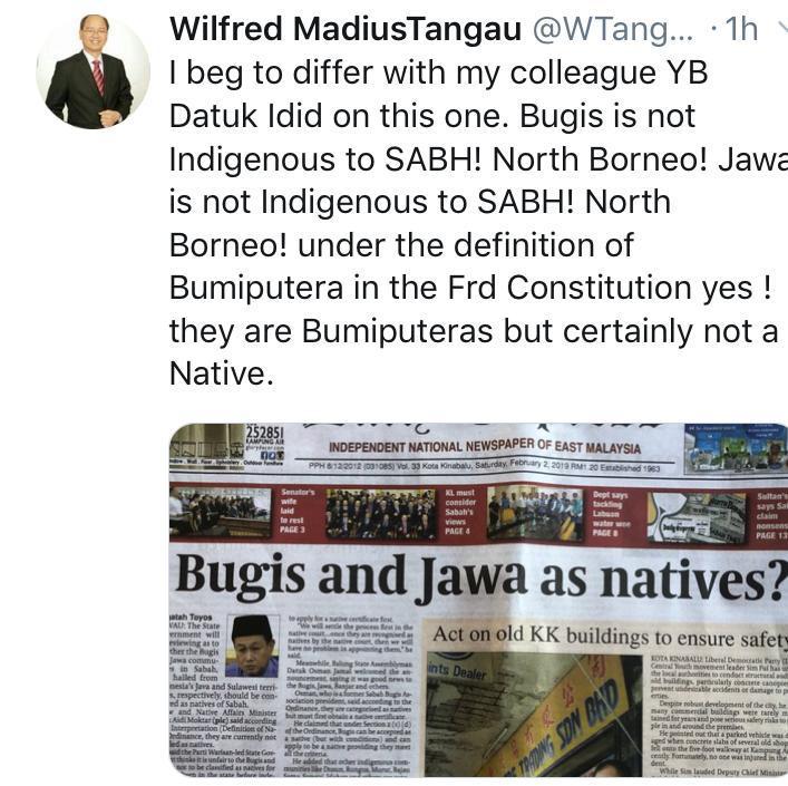 Turut membantah ialah Timbalan Ketua Menteri, Datuk Seri Panglima Wilfred Madius Tangau berkata kaum Bugis dan Jawa bukan orang asal Sabah mahupun North Borneo dan dengan itu mereka tidak boleh diiktirafkan sebagai anak negeri Sabah.