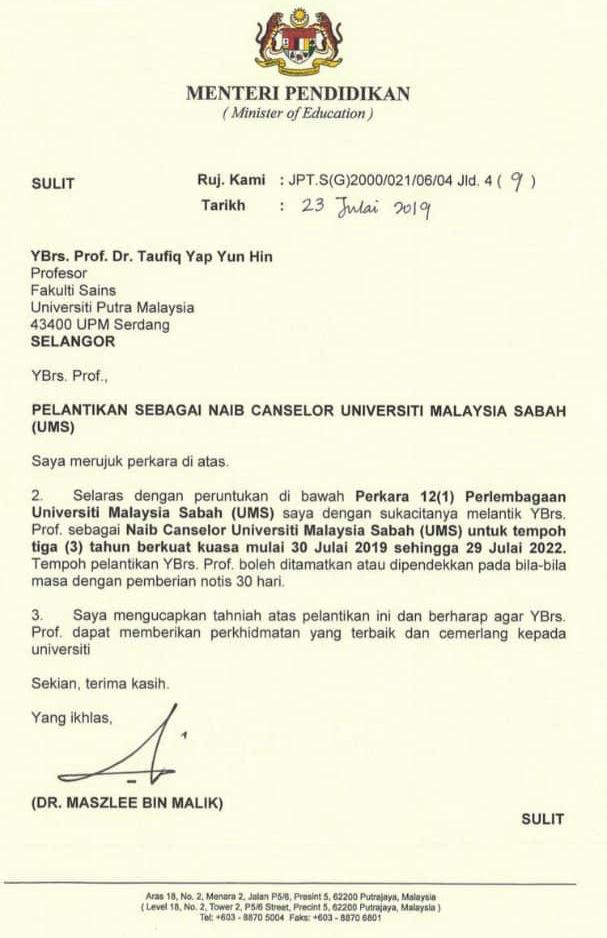 Dr Maszlee Malik Menteri Pendidikan Malaysia yang juga ahli IKRAM telah bersetuju melantik Dr Taufiq melalui suratnya bertarikh 23 Julai 2019 dan surat Ketua Pengarah Pendidikan Tinggi Datin Paduka Ir Dr Siti Hamisah binti Tapsir bertarikh 24 Julai 2019.