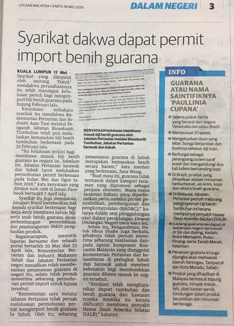 Bagaimanapun 18 Mei 2019 muka depan Utusan Malaysia dengan tajuk Skandal Buah Brazil- Petani ditipu serah tanah telah mengejutkan semua pihak bahawa projek guarana ini adalah sebuah projek penipuan. Jabatan Pertanian kekal melarang pengimportan biji dan bahan tanaman ini masuk ke negara ini kerana mempunyai penyakit Hawar Daun Amerika Selatan (SALB - South American Leaf Blight) yang sangat merbahaya kepada industri getah dan tanaman lain dalam negara.
