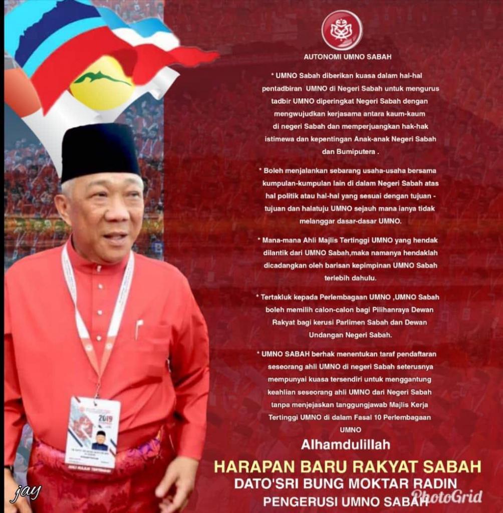 Pengerusi Umno Sabah Bung Moktar Radin berkata, peralihan tersebut memaktubkan kewujudan Umno Sabah sebagai sebuah entiti politik yang berautonomi kerana hanya orang Sabah yang lebih arif akan masalah dan perkara yang boleh dilakukan di negeri itu.