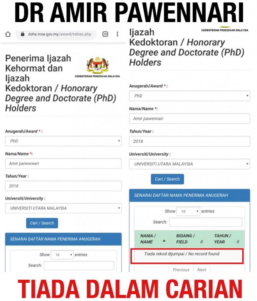 Semakan di portal penerima ijazah kedoktoran (Phd) Pendidikan tinggi Malaysia tiada ada penama Dr Amir Pawennari. Malah semakan dibuku Majlis Konvokesyen UUM 2018 tidak ada penerima Phd bernama Dr Amir Pawennari.