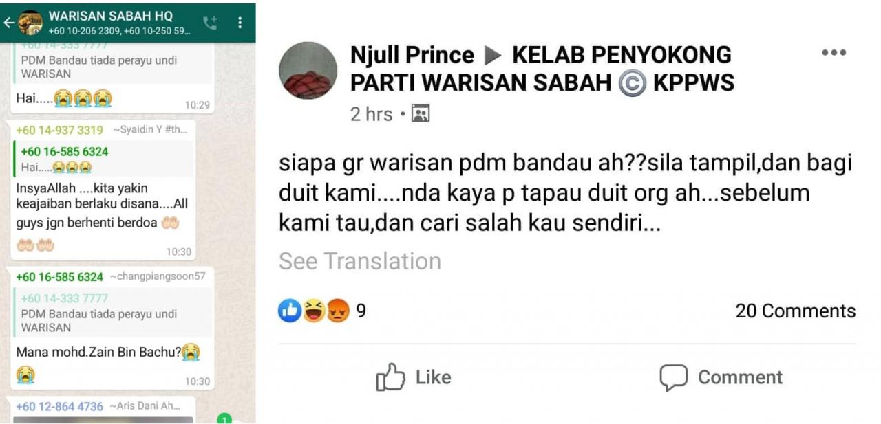 Terdapat laporan ada jentera dan perayu undi tidak kelihatan di PDM kerana petugas parti Warisan membawa lari wang untuk jentera dan pengundi menyebabkan ramai petugas boikot.