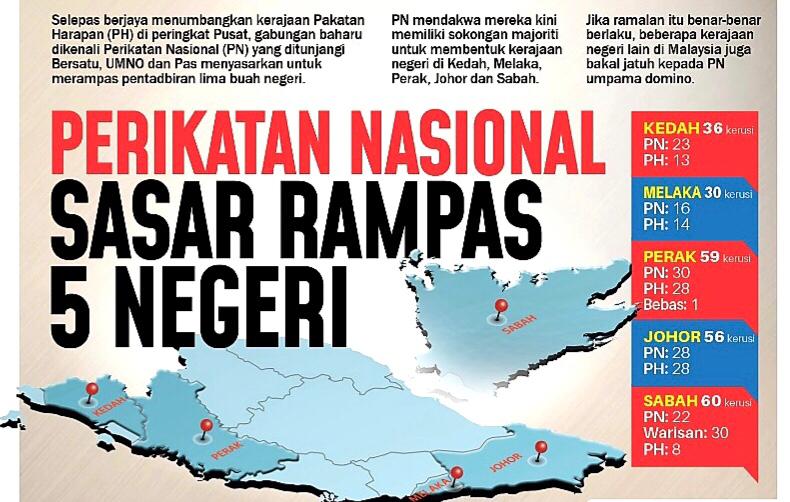 SHAH ALAM - Selepas tumbangnya Pakatan Harapan (PH) di Johor dan Melaka, Perikatan Nasional dijangka menyasarkan untuk merampas tiga lagi negeri iaitu Perak, Kedah dan Sabah.