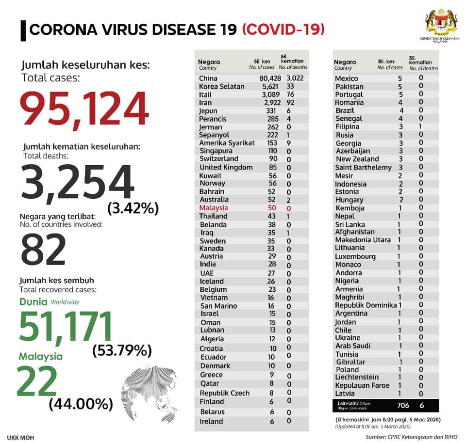 Status semasa virus Covid-19 di Malaysia 5 Mac 2019