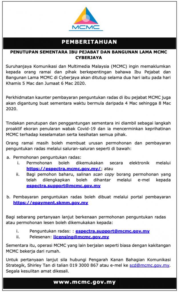 Sementara itu hari ini Suruhanjaya Komunikasi dan Multimedia Malaysia telah mengumumkan yang mana mereka akan menutup sementara ibu pejabat dan bangunan lama MCMC Cyberjaya. Kedua-dua bangunan ini akan ditutup selama dua hari ini, iaitu pada 5 Mac dan juga 6 Mac 2020.
