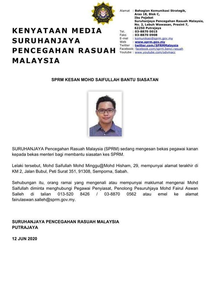 Susulan daripada itu SPRM turut mengumumkan pencarian bekas Setiausaha Sulit Kanan MohammadinMohamaddin Ketapi itu iaitu Mohd Saifullah Mohd Minggu@ Mohd Hisham dan dilaporkan dalam media masa. Semua ini adalah berkaitan dengan projek promosi pengiklanan kelolaan Lembaga Penggalakan Pelancongan Malaysia (Tourism Malaysia) itu. Surat dan minit Menteri kepada projek itu menjadi siasatan kepada