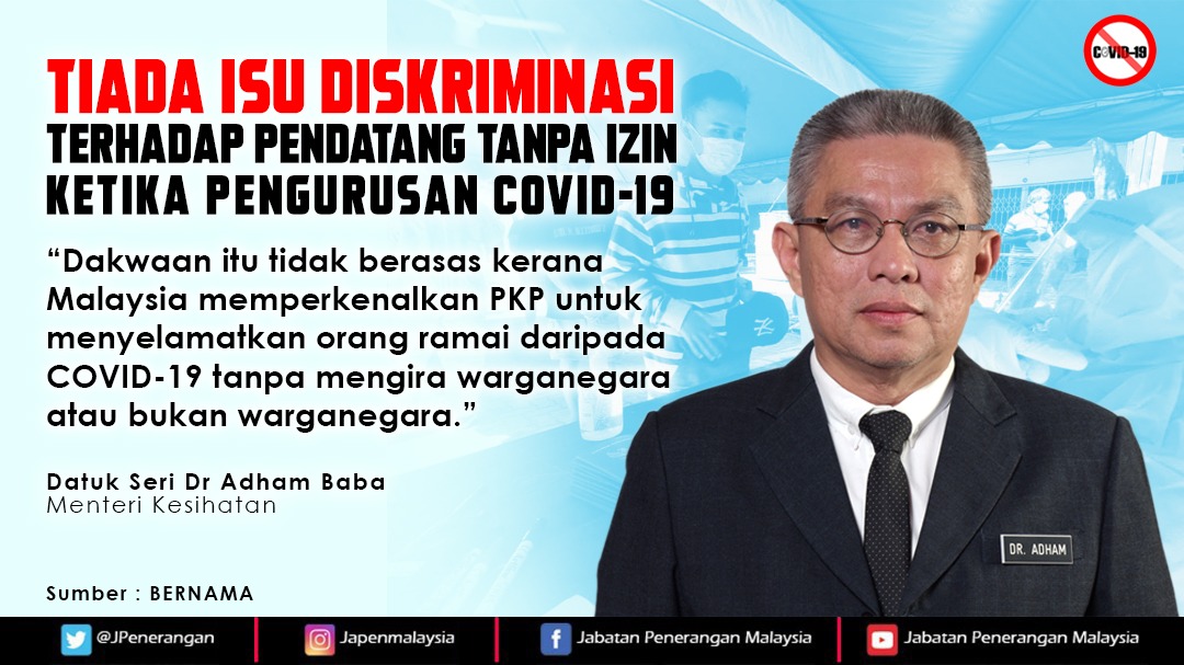 Datuk Seri Dr Adham Baba Menteri Kesihatan Malaysia (KKM) paling awal menyangkal dakwaan laporan dari agensi berita antarabangsa Al Jazeera yang mendakwa kerajaan Malaysia mendiskriminasi pendatang asing ketika menangani pandemik COVID-19.