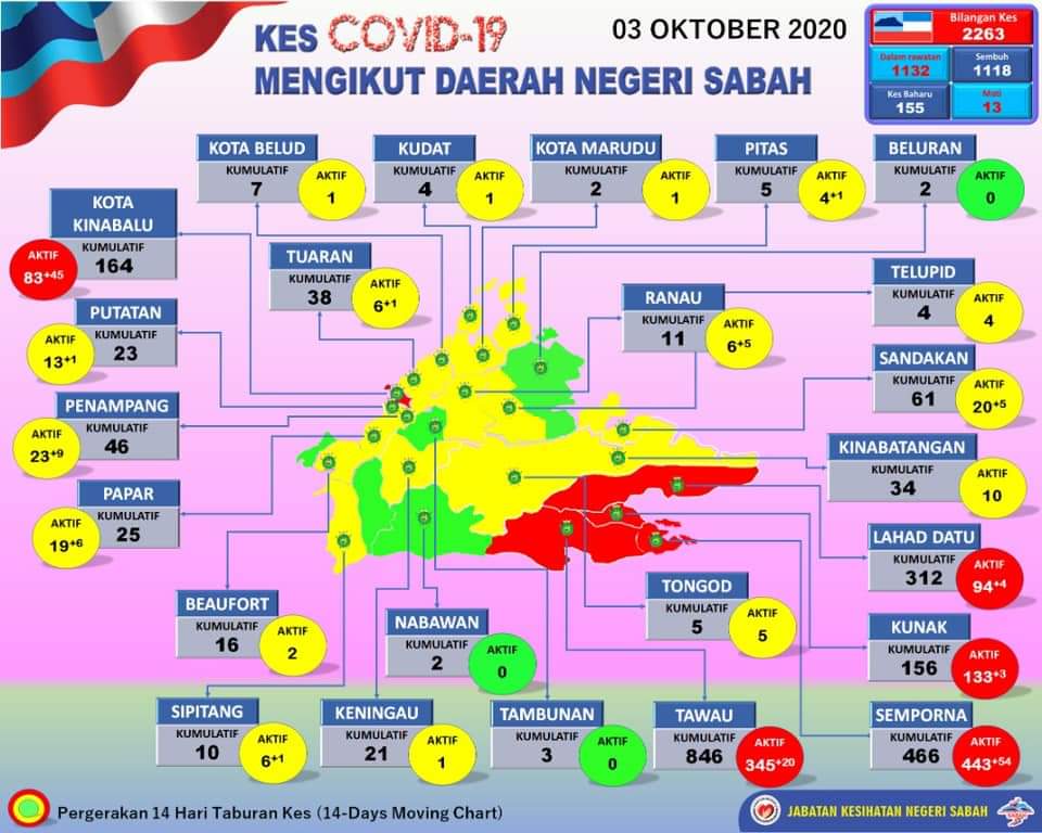 Penambahan 155 kes baharu itu menjadikan bilangan kumulatif kes Covid-19 di Sabah mencecah 2,263 kes dengan 1,132 kes aktif.