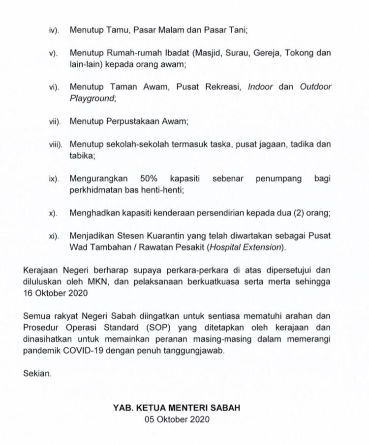 Keputusan ini dibuat selepas mesyuarat khas menteri-menteri hari ini mendengar situasi semasa Covid-19 di seluruh Sabah yang dibentangkan oleh Kementerian Kesihatan dan cadangan kerajaan Sabah.