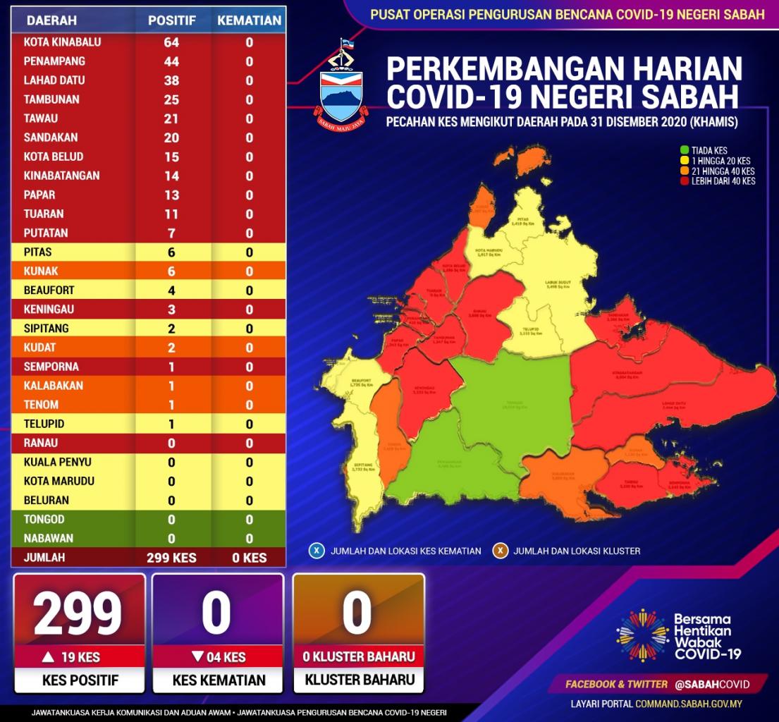 Daerah Kota Kinabalu merekodkan jumlah kes positif baharu tertinggi sebanyak 64 kes kemudian diikuti Penampang (44), Lahad Datu (38), Tawau (21), Sandakan (20); Kota Belud (15) Papar (13) dan Tuaran (7).