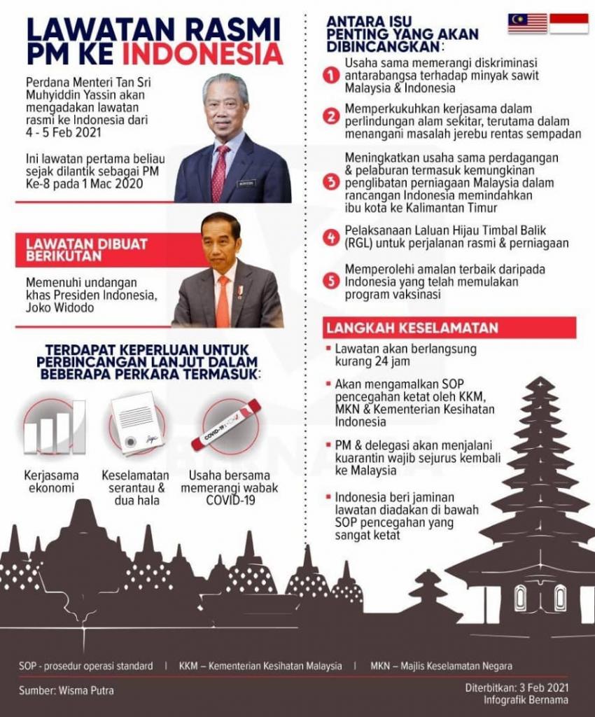 12. Lawatan Tan Sri Dato’ Sri Haji Muhyiddin bin Haji Mohd. Yassin ke Republik Indonesia pada 4 hingga 5 Februari 2021 memberi mesej besar Malaysia sedang berusaha memulihkan ekonominya. Banyak perkara boleh dicapai termasuk kerjasama ekonomi antara kedua buah negara.