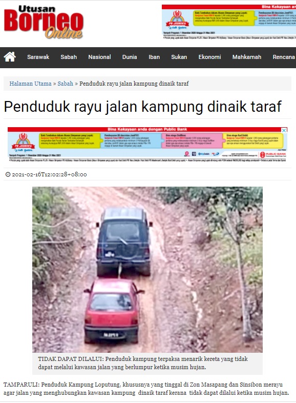 Semalam Utusan Borneo melaporkan Penduduk Kampung Loputung Tamparuli, khususnya yang tinggal di Zon Masapang dan Sinsibon merayu agar jalan yang menghubungkan kawasan kampung dinaik taraf kerana tidak dapat dilalui ketika musim hujan.