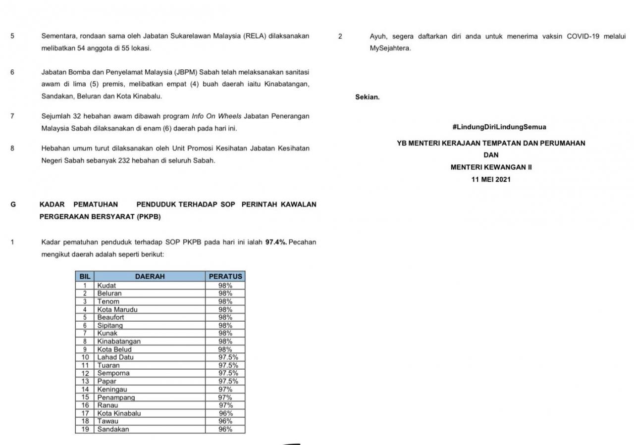 Sebagaimana diumumkan oleh Menteri Kerajaan Tempatan dan Perumahan negeri, Datuk Seri Masidi Manjun sebelum ini bahawa Sabah masih di bawah Perintah Kawalan Pergerakan Bersyarat (PKPB) bermula 12 Mei sehingga 7 Jun depan.