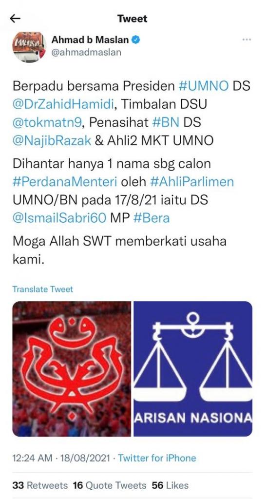 "Dihantar hanya satu nama sebagai calon #PerdanaMenteri oleh #AhliParlimen UMNO/BN pada 17/8/21 iaitu Ahli Parlimen Bera, Datuk Seri Ismail Sabri Yaacob.