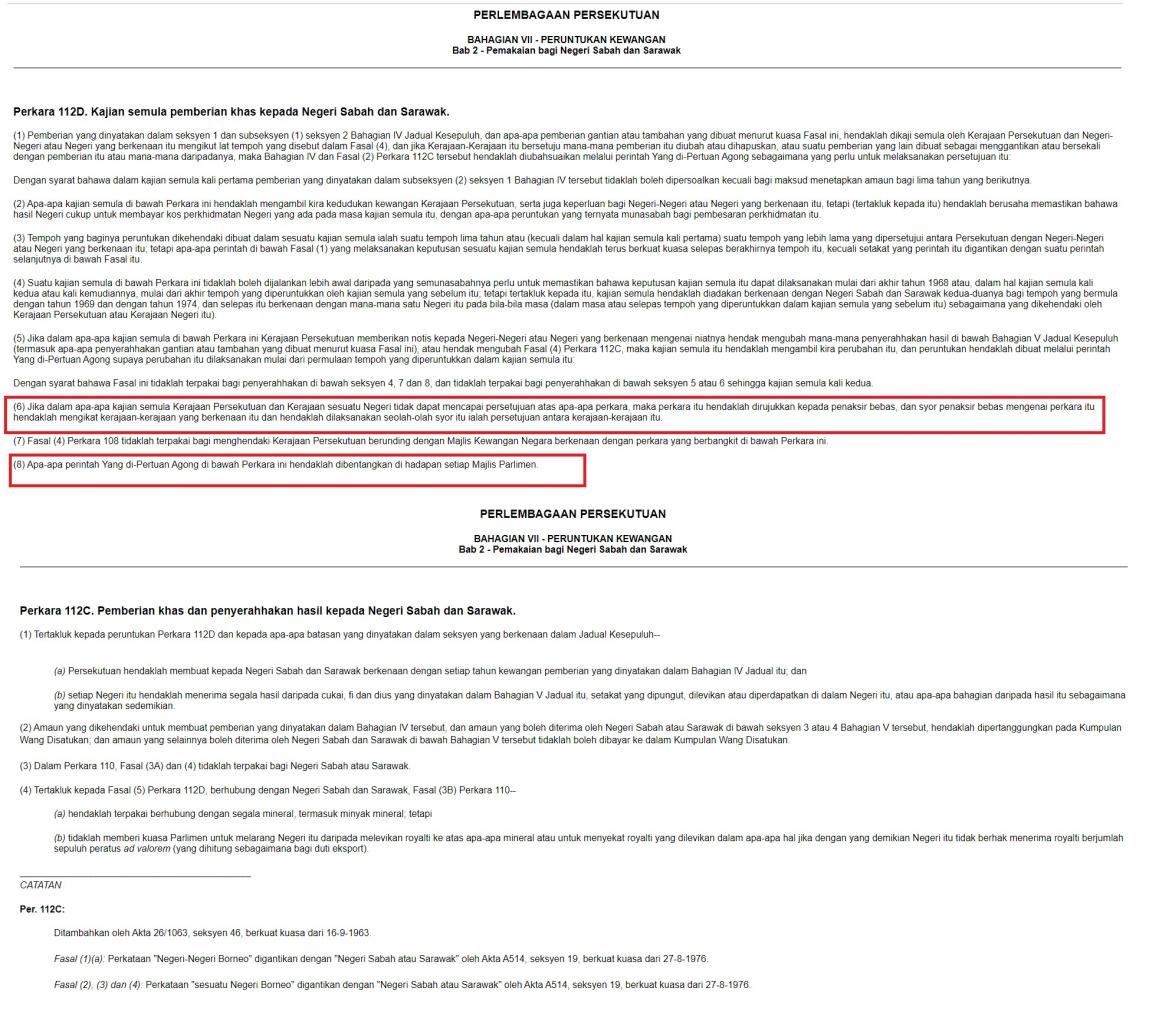 "Pelaksanaan kajian semula pemberian khas ini termasuk hak kedua-dua Kerajaan Persekutuan dan Kerajaan Sabah untuk merujuk perkara itu kepada penaksir bebas (jika tiada persetujuan dicapai) seperti dinyatakan dalam Perkara 112D(6) Perlembagaan Persekutuan.