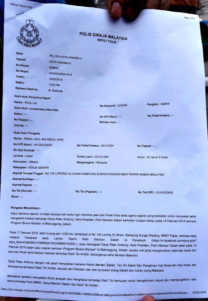 Kedua-dua laporan polis itu telah dibuat di Balai Polis Karamunsing, Kota Kinabalu. Perbuatan menghasut rakyat dengan tuduhan tidak berasas seperti ini dikhuatiri bukan sahaja akan memberi kesan pada kestabilan politik negara, tetapi turut berpotensi memecah belahkan keharmonian rakyat. - Sabahkini2