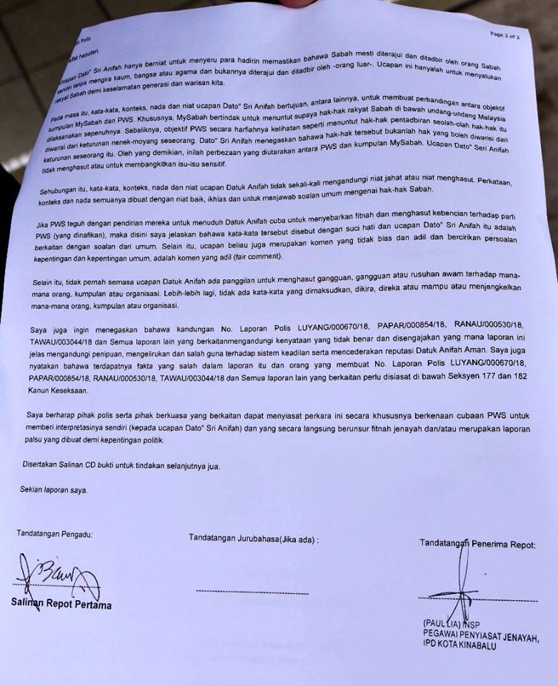 Sementara itu, laporan ke atas Setiausaha Agung Parti Warisan Sabah itu pula telah dibuat oleh Setiausaha Politik Anifah, sebagai respon terhadap laporan polis yang dibuat oleh Parti Warisan Sabah ke atas Anifah, minggu lalu.