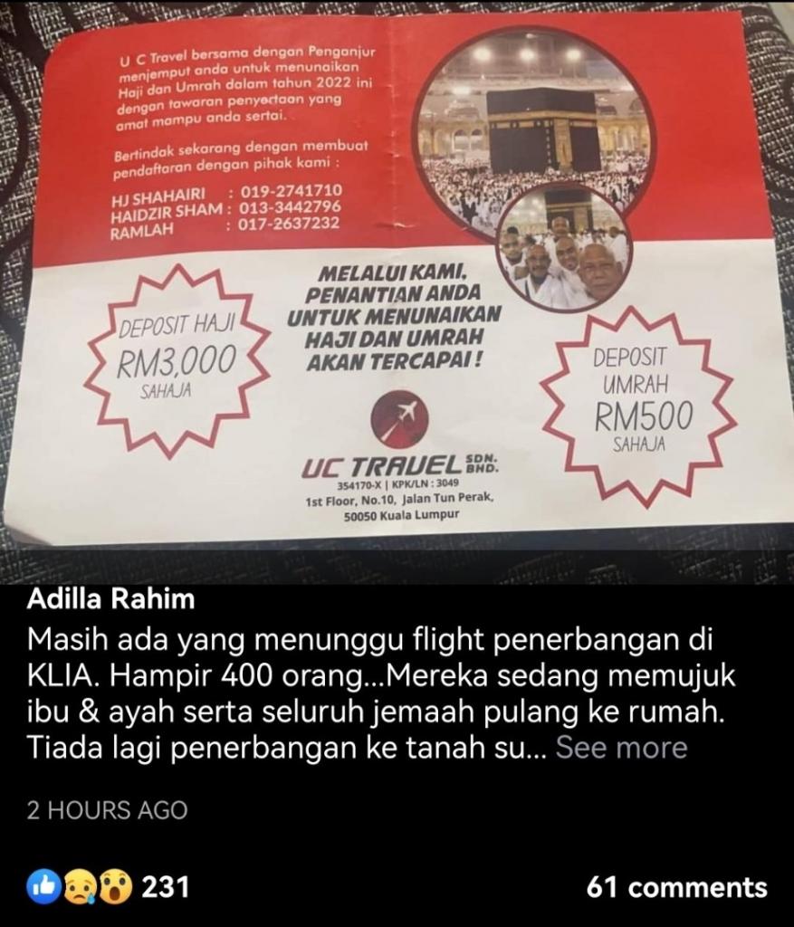 “Jutaan maaf dari pihak kami UC Travel. Kami sudah sedaya-upaya berusaha untuk terbangkan jemaah, tetapi kami tidak berjaya.