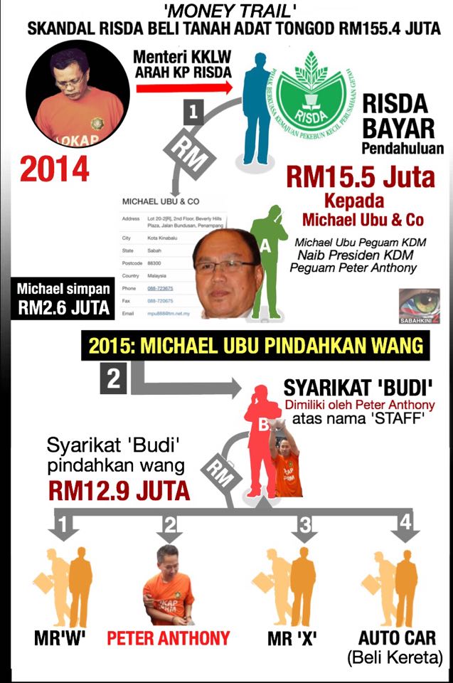 “Kes RISDA sangat mudah dan terdapat bukti yang jelas iaitu arahan Menteri KKLW, Ketua Pengarah RISDA meluluskan pembayaran kepada Firma Guaman milik Michael Ubu RM15.5 juta pendahuluan (deposit) ke akaun firma itu dan Michael Ubu kemudiannya memindahkan wang itu kepada beberapa pihak termasuk ke akaun Datuk Peter Anthony”. kata sumber itu.