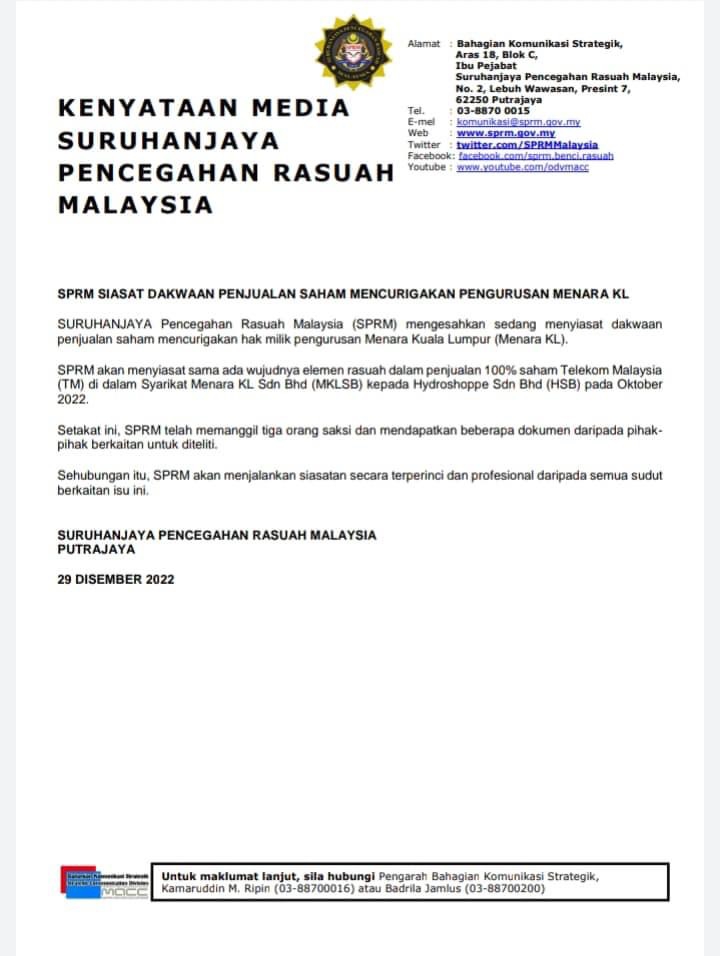 SPRM siasat penjualan saham TM dalam Menara KL
