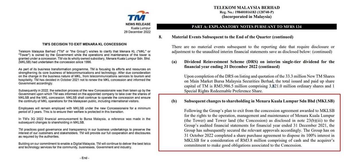 “Selepas pertimbangan sewajarnya terhadap perubahan sifat perniagaan Menara KL, daripada perkhidmatan telekomunikasi kepada pelancongan dan hospitaliti, TM memutuskan pada Oktober 2021 untuk tidak memperbaharui konsesi MKL dan telah memaklumkan kerajaan dengan sewajarnya," kata syarikat itu.
