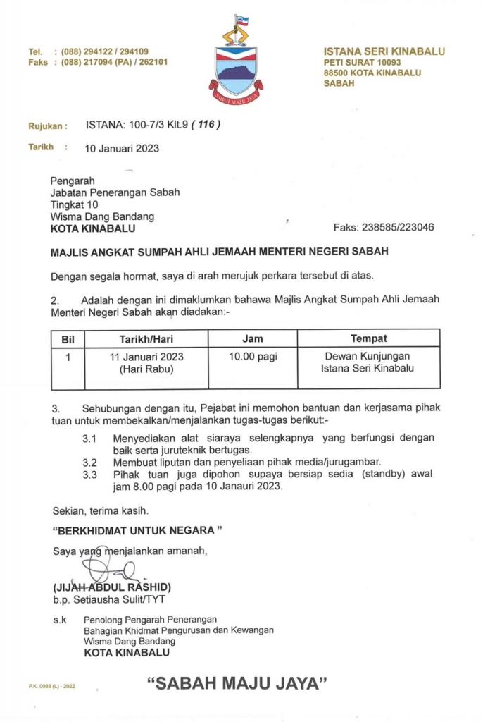 Melalui surat yang diterima oleh Sabahkini2 jemputan ke majlis itu yang diadakan 11 Januari (Rabu)namun belum ada senarai nama Ahli Dewan Undangan Negeri (ADUN) yang bakal mengangkat sumpah jawatan.