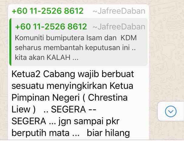 “Ketua-ketua cabang wajib berbuat sesuatu menyingkirkan Ketua Christina Liew Pengerusi MPN Sabah. Segera..Jangan sampai PKR berputih mata, biar hilang seorang jangan hilang keyakinan ahli PKR”. kata seorang bernama Jafree Daban dalam aplikasi Whatapps Keadilan Untuk Karambunai.