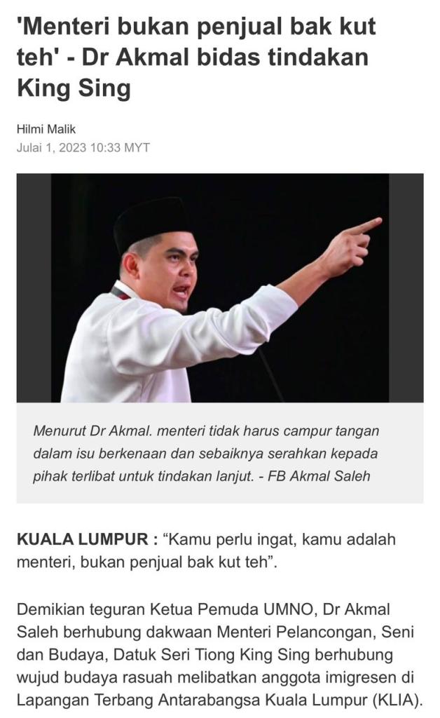Cuma yang rakyat tak faham mengapa Dr Akmal Saleh Ketua Pemuda UMNO Malaysia beria-ia sangat menyerang Datuk Seri Tiong King Sing? Hanya kerana dia melalui media bukan tahu isu sebenar mulut dia lebih celupar dengan desakan tidak masuk akal.