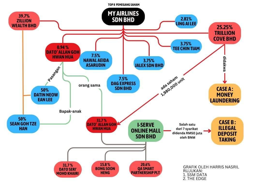 Maklumat Suruhanjaya Syarikat Malaysia (SSM) menunjukkan Ahli perniagaan ‘scammer’ Datuk Allan Goh Hwan Hua merupakan pemegang saham tunggal terbesar syarikat penerbangan itu.