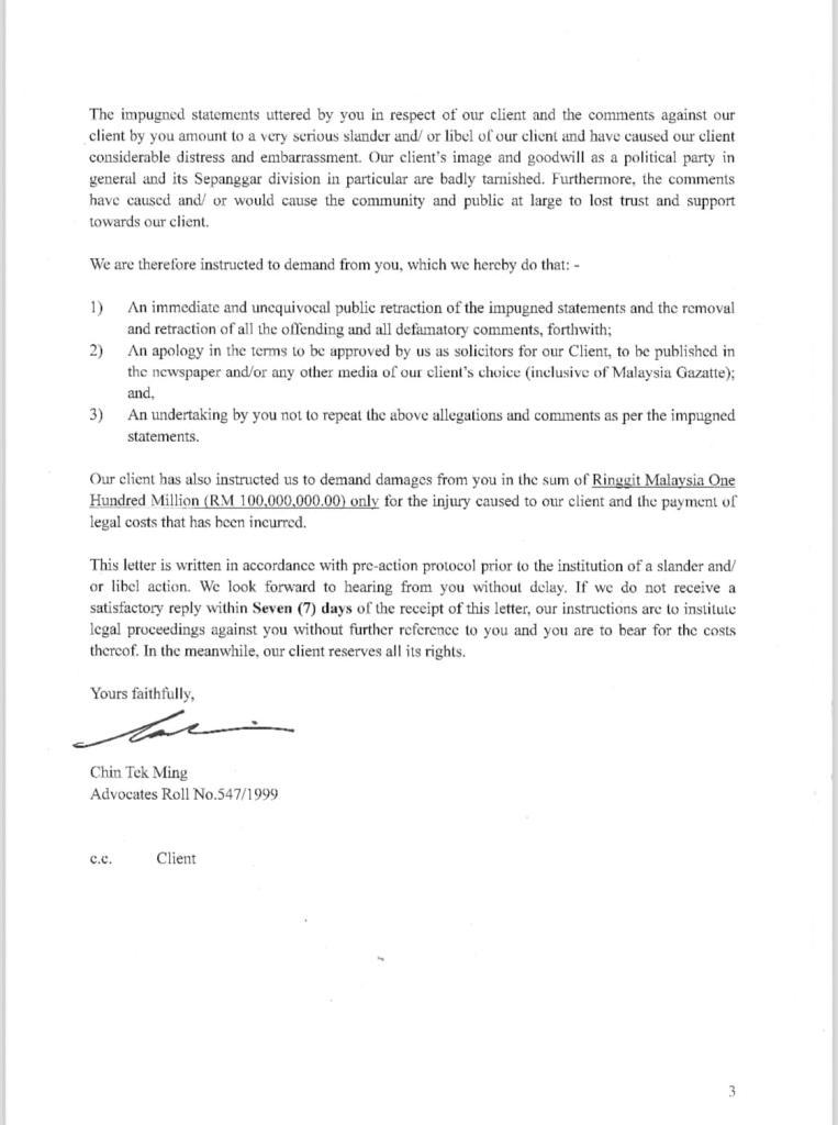 Beranikah Azis Jamman mengeluarkan Letter of Demand terhadap KAMAR JERI? sebagaimana surat peguam di bawah kepada Zulkarnain Mahdar?