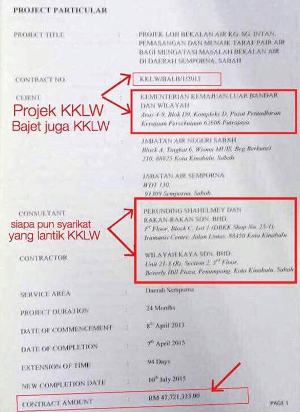 Projek Loji Air Sungai Intan dirancang dan ditender oleh Dato' Seri Shafie Apdal, bukan Ketua Menteri Sabah. Malah, yang MENANDATANGANI SURAT SETUJU TERIMA (LOA) dan menyediakan dokumen kontrak pelantikan kontraktor bagi Projek KKLW juga adalah Dato' Seri Shafie Apdal.