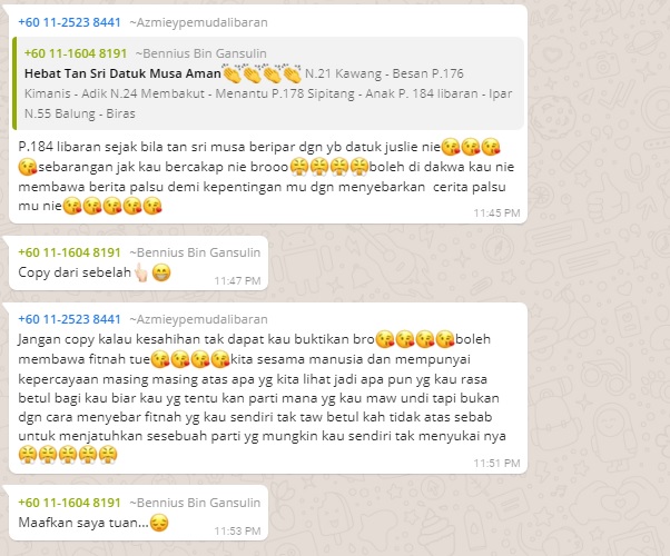 “P.184 Libaran sejak bila Tan Sri Musa beripar dengan YB Datuk Juslie? Sembarangan sahaja bercakap. Ini boleh didakwa membawa berita palsu. Demi kebaikan elakkan menyebar berita palsu”. katanya