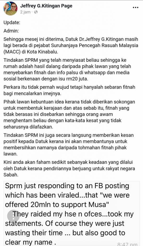 Jeffrey yang juga Ahli Dewan Undangan Negeri (ADUN) Tambunan dan Ahli Parlimen Keningau, berkata SPRM menghubunginya kelmarin ketika beliau di Tambunan sebelum datang ke rumah dan pejabatnya di Keningau, petang semalam.
